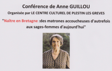Conférence de Anne GUILLOU Sociologue, spécialisée en sociologie rurale qui a donné dans ses écrits une grande place aux femmes de la terre. retraitée de l’Université, elle a publié de nombreux romans souvent inspirés de ses thèmes de recherche. « Naître en Bretagne : des matrones accoucheuses d’autrefois aux sages-femmes d’aujourd’hui »est organisée par le centre culturel de Plestin.