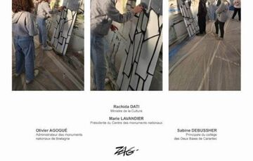 Le rendez-vous entre ZAG, street artiste hyper actif sur sa région morlaisienne d’adoption et le cairn de Barnenez était écrit… Il restait à associer les élèves du collège des Deux Baies de Carantec à ce projet qui n’attendait que ces derniers acteurs pour se concrétiser. Le choix de la céramique, caractéristique de la période de construction du monument, s’est vite imposé comme motif principal. Durant une semaine complète de résidence au collège, ZAG a initié le jeune public, les deux classes de 6 ème A et B, à la pratique du graff, accompagné par le service pédagogique du Centre des monuments nationaux qui a proposé toute une série d’animations en lien avec la Préhistoire et le mégalithisme régional.