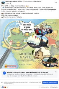 La page Facebook de Guerlesquin approche les 1584 abonnés. Avec un rythme d’une publication quasi quotidienne, la page a trouvé son public. Les posts qui rencontrent le plus de succès sont liés aux marchés animés (programme, vidéo en direct), globalement aux animations, également à la randonnée (vélo, VTT, pédestre).