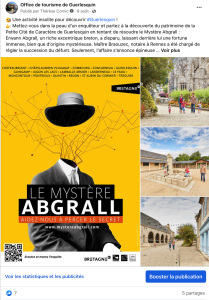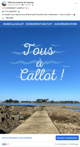 La page Facebook de Carantec réunit désormais 7249 abonnés. Les posts “Bon weekend à Carantec” accompagnés d’une photo, d’un point de vue sur la commune, l’île Louët ou Callot, dont l’esthétique maritime séduit encore et toujours, comptent parmi les posts les plus appréciés. Les programmes des visites guidées ont été largement partagés.