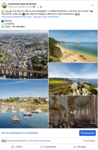 La page Facebook de Guerlesquin approche les 1730 abonnés. Avec un rythme d’une publication quasi quotidienne, la page a trouvé son public. Les posts qui rencontrent le plus de succès sont liés aux marchés animés (programme, vidéo en direct), globalement aux animations, également à la randonnée (vélo, VTT, pédestre).