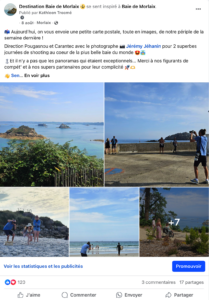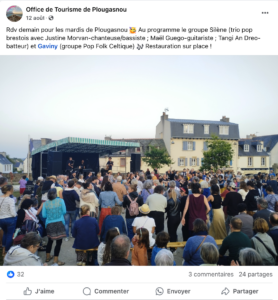 La page Facebook de Plougasnou atteint 7 668 abonnés en cette fin d’été. Nous pouvons noter de bons retours en commentaires sous les posts concernant les animations à Plougasnou : Mardis de Plougasnou (9 380 impressions), Port en fête, marché, etc. Les publications avec des photos et vidéos fonctionnent très bien.