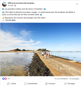 La page Facebook de Carantec réunit désormais 8 423 abonnés. Le post sur les grandes marées publié fin août est celui qui a le plus emballé la communauté avec près de 25 000 impressions. Les publications sur les animations fonctionnent très bien, de même pour celles qui valorisent nos partenaires.